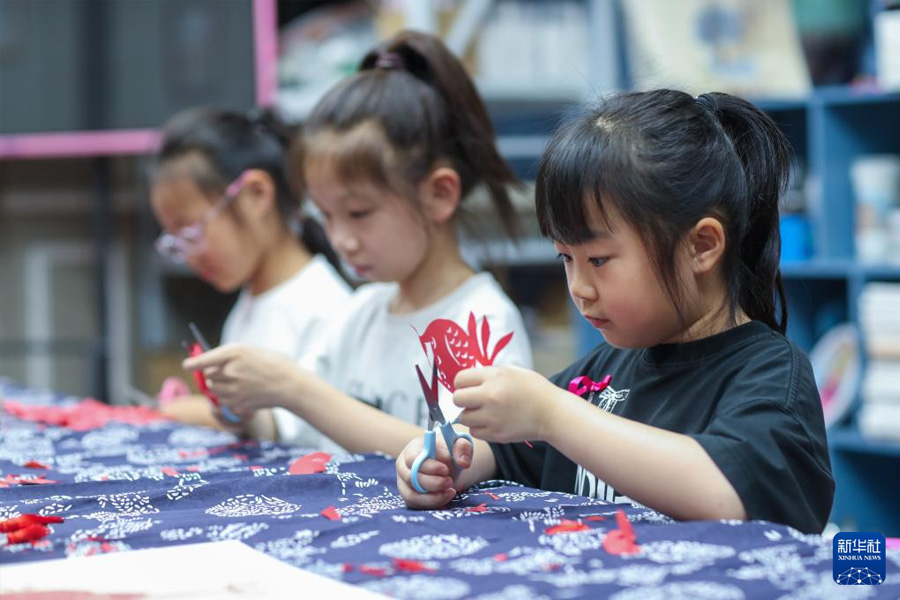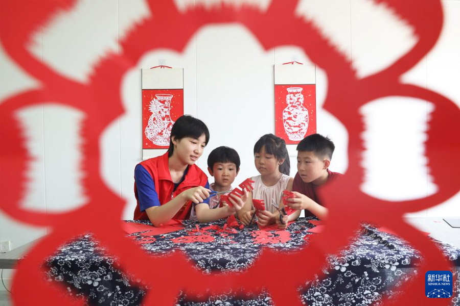 1/07月11日,在河北省唐山市豐潤區(qū)燕山路街道欣園社區(qū)暑托班上,志愿者在指導(dǎo)孩子們學(xué)習(xí)剪紙。(新華社發(fā) 朱大勇/攝)