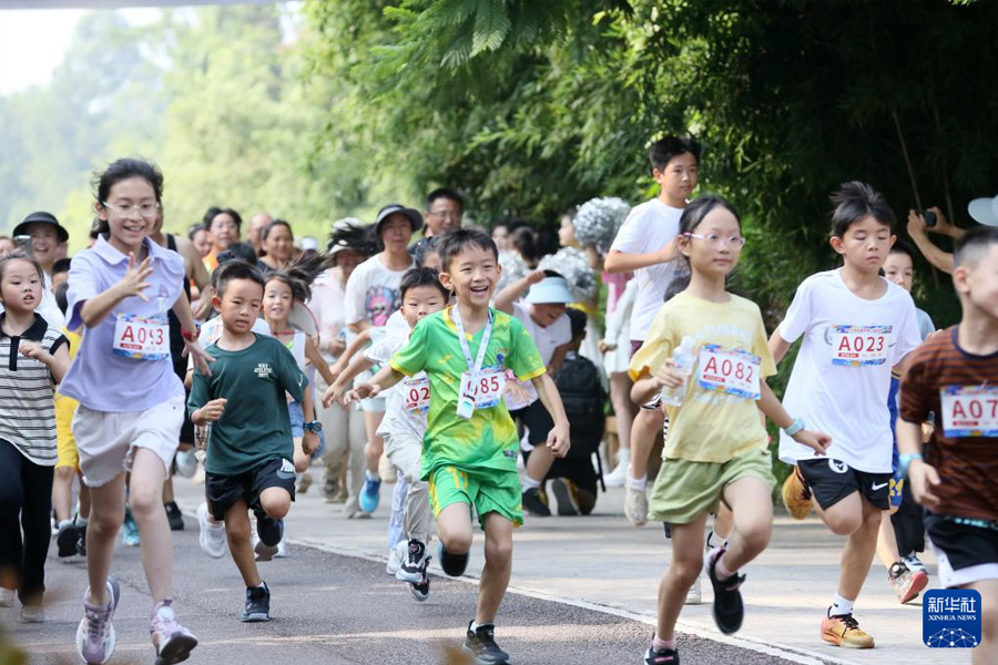 1/07月12日,在四川省樂山市嘉州綠心公園,孩子們和大人一起在健身步道跑步健身。(新華社發(fā) 李華時/攝)