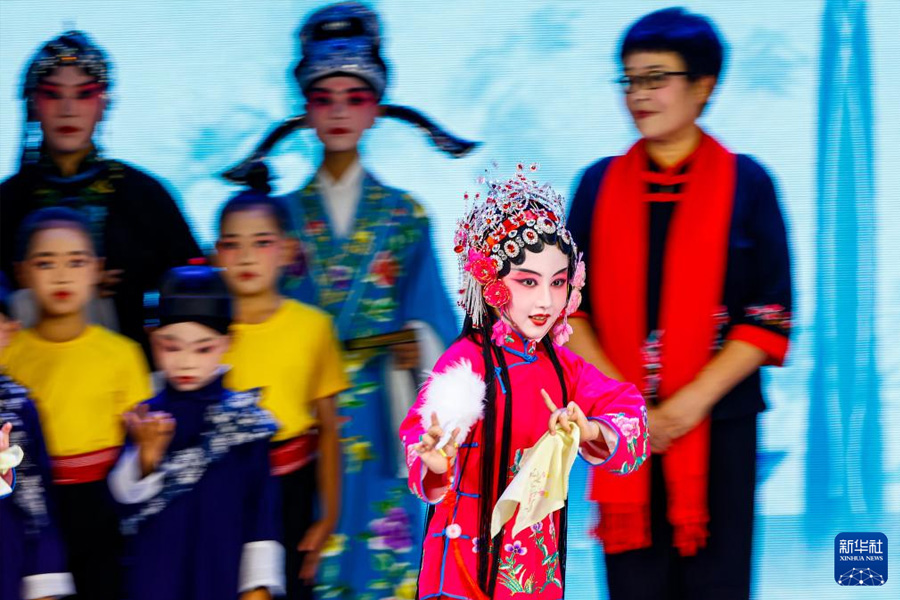 1/07月12日,在天津市濱海新區(qū)漢沽大劇院,孩子們在表演傳統(tǒng)戲曲。(新華社發(fā) 杜鵬輝/攝)
