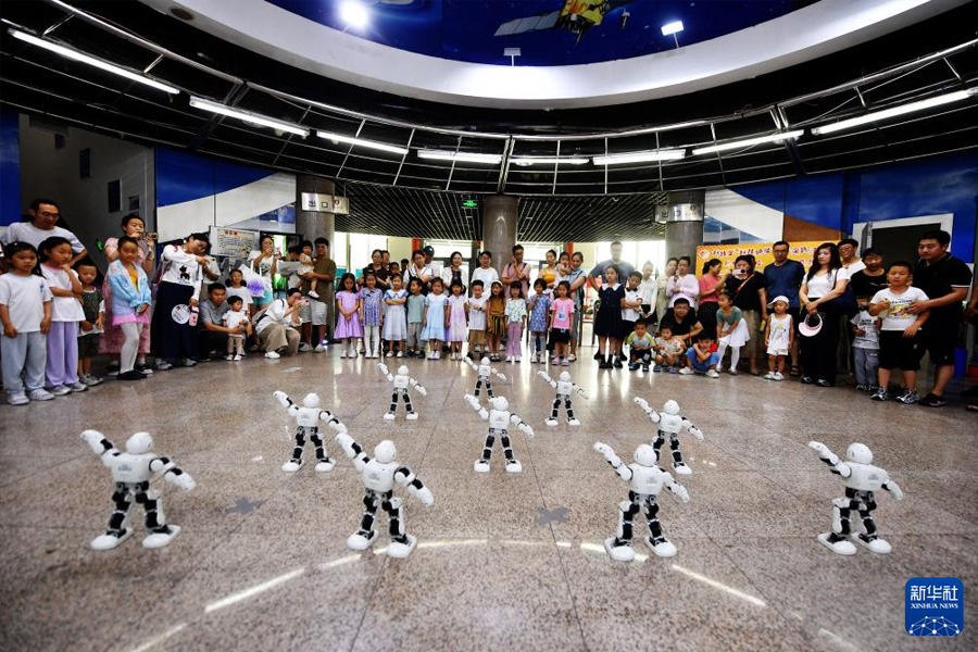 1/07月12日,山東省青島市市北區(qū)海安幼兒園的小朋友們在觀看舞蹈機器人表演。暑假期間,孩子們通過參加形式多樣的活動,豐富暑期生活,暢享快樂時光。(新華社發(fā) 王海濱/攝)