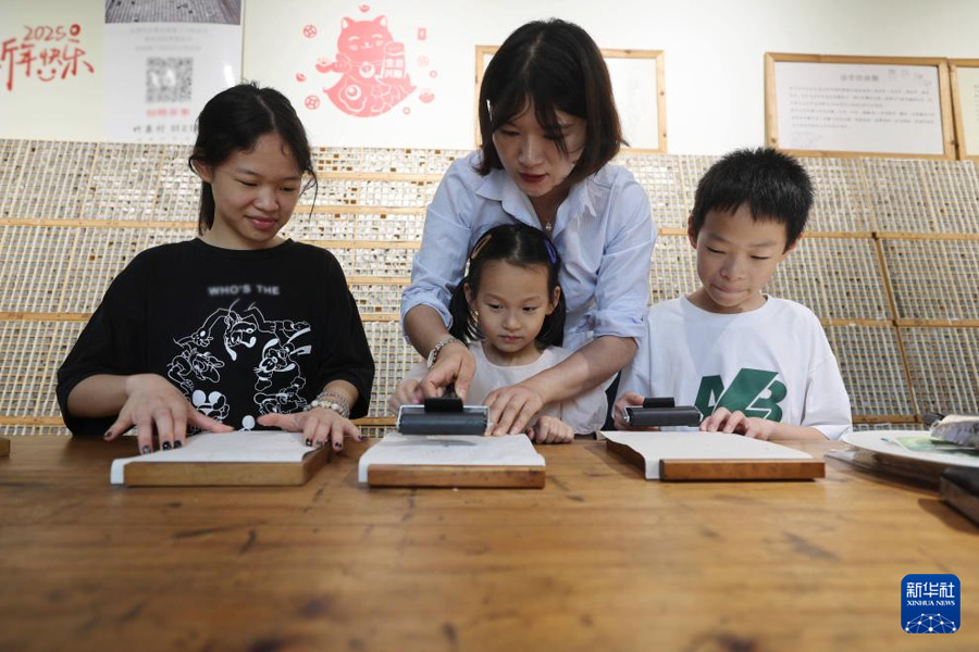 1/07月12日,在山東省臨沂市沂南縣銅井鎮(zhèn)竹泉村時光印記活字印刷體驗館,參加研學(xué)游的孩子們在體驗活字印刷術(shù)。(新華社發(fā) 王彥冰/攝)