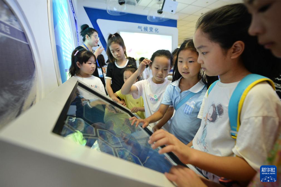 1/08月10日,山東省青島市城陽區(qū)景明學(xué)校,小朋友在氣象科普館學(xué)習(xí)氣象知識。(新華社發(fā) 王海濱/攝)