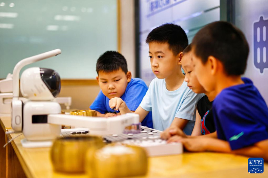 1/08月10日,小朋友在天津濱海文化中心與機器人下圍棋。(新華社發(fā) 杜鵬輝/攝)
