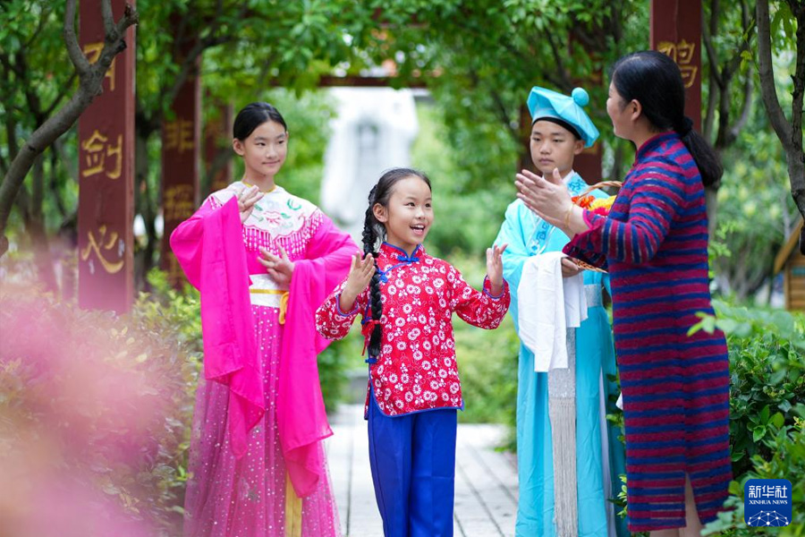1/08月10日,在江蘇省泰州市姜堰區(qū)城西小學(xué)的少兒戲曲公益暑托班上,老師指導(dǎo)孩子們練習(xí)戲曲基本動作。(新華社發(fā) 周社根/攝)