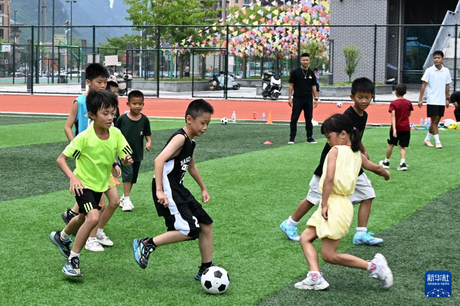 1/08月10日,在廣西河池市羅城仫佬族自治縣體育中心足球場,小朋友在踢足球。(新華社發(fā) 韋如代/攝)