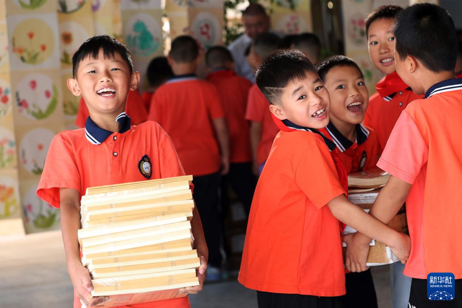 1/09月1日,重慶市黔江區(qū)武陵小學(xué)二年級(jí)學(xué)生在領(lǐng)取新書。(新華社發(fā) 楊敏/攝)