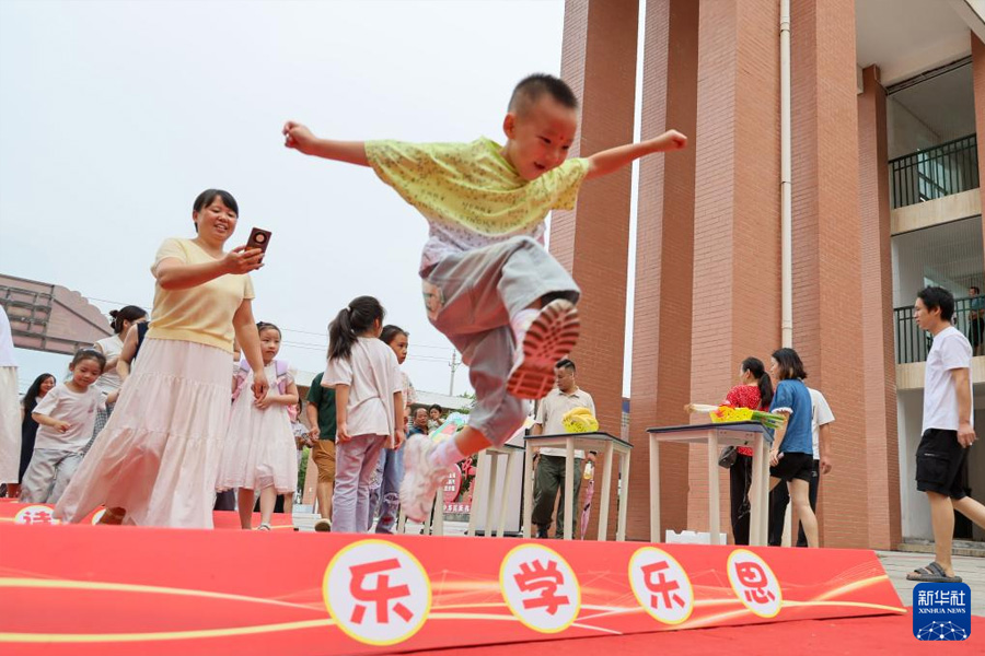 1/09月1日,湖北省咸寧市浮山學(xué)校新入學(xué)的小學(xué)生跨越“成長(zhǎng)跨欄”,喜迎新學(xué)期。(新華社發(fā) 吳濤/攝)