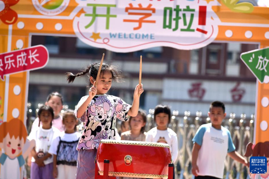 1/09月1日,山東省淄博市沂源縣魯陽(yáng)小學(xué)新入校的小學(xué)生在開學(xué)第一課上擊鼓鳴志。(新華社發(fā) 趙東山/攝)