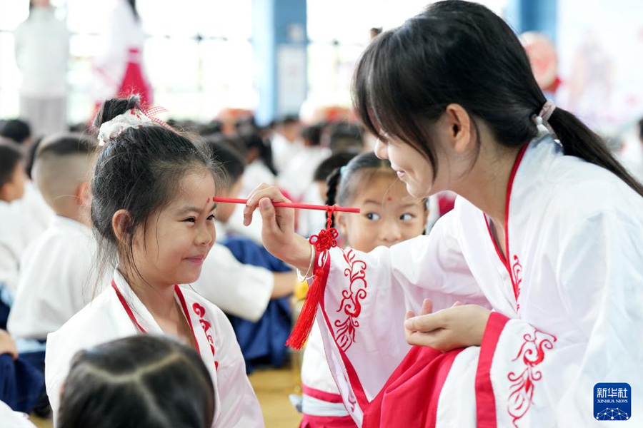 1/09月1日,廣西南寧市邕寧區(qū)龍崗北小學(xué)老師在給一年級(jí)新生點(diǎn)朱砂。(新華社發(fā) 馬華斌/攝)