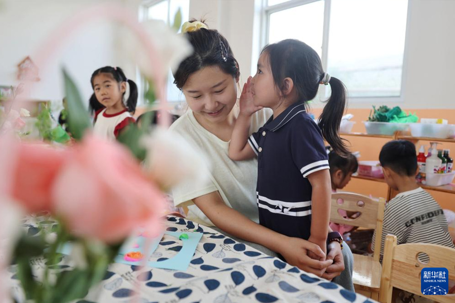 1/09月9日,在山東省臨沂市沂南縣銅井鎮(zhèn)中心幼兒園,小朋友在跟老師分享節(jié)日祝福悄悄話。(新華社發(fā) 王彥冰/攝)