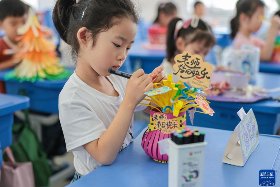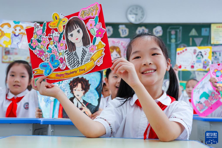 1/09月9日,在江蘇省句容市實(shí)驗(yàn)小學(xué),學(xué)生展示手工制作的教師節(jié)賀卡。(新華社發(fā) 鐘學(xué)滿/攝)