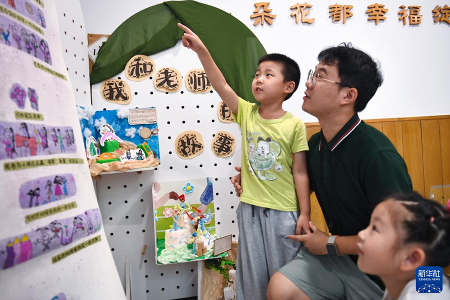 1/09月9日,在南京新世紀(jì)實(shí)驗(yàn)幼兒園,小朋友給老師講述自己創(chuàng)作的“我和老師的故事”。(新華社發(fā) 楊素平/攝)