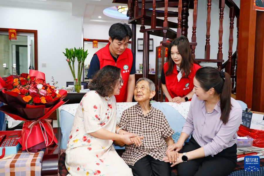 1/09月9日,在江蘇省海安市海安街道復(fù)興社區(qū),退休老教師王婉華(中)在家中與前來慰問的社區(qū)志愿者和青年教師聊天交流。(新華社發(fā) 顧彬斌/攝)