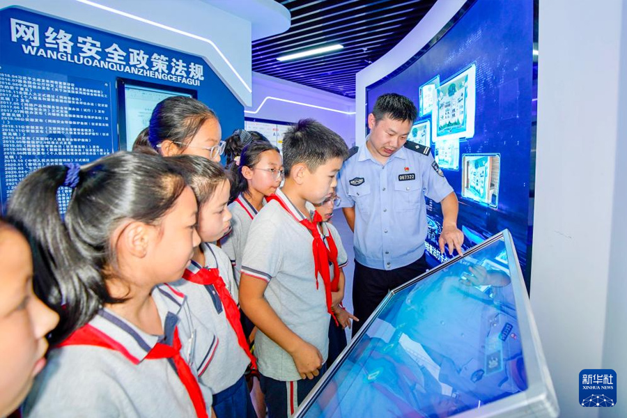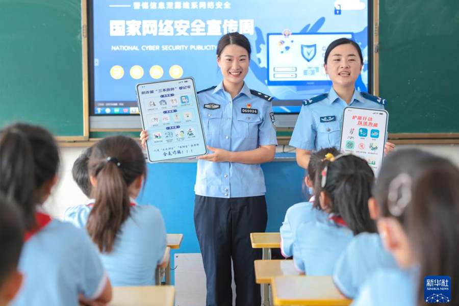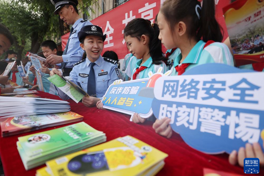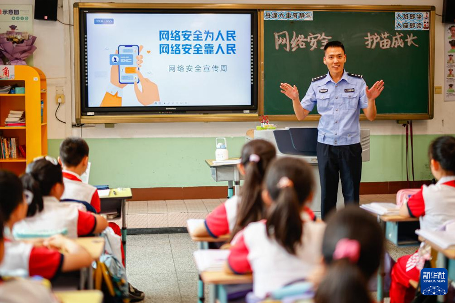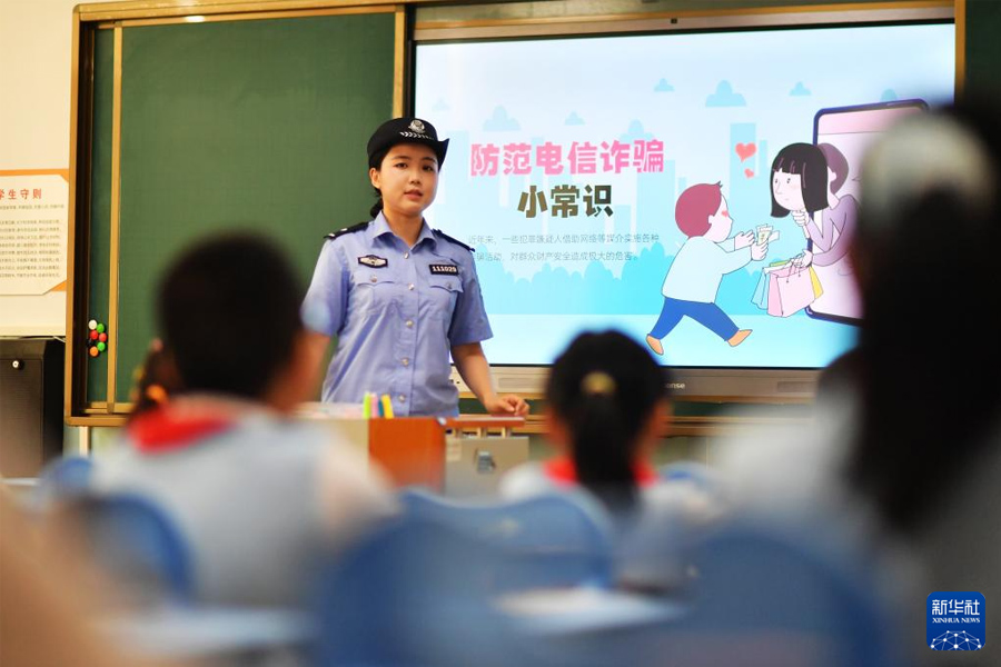 1/09月15日,在山東省青島市市北區(qū)延安二路小學(xué)開展的網(wǎng)絡(luò)安全教育主題活動(dòng)上,民警為學(xué)生們講解防范電信詐騙小常識(shí)。9月15日至21日,以“網(wǎng)絡(luò)安全為人民,網(wǎng)絡(luò)安全靠人民——以高水平安全守護(hù)高質(zhì)量發(fā)展”為主題的國家網(wǎng)絡(luò)安全宣傳周在全國范圍內(nèi)開展。(新華社發(fā) 王海濱/攝)