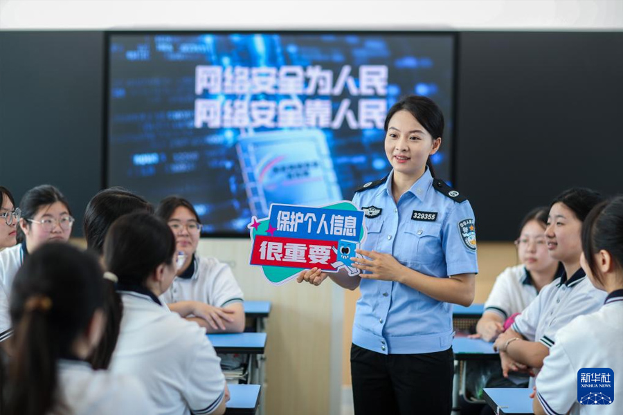 1/09月15日,浙江省舟山市岱山縣公安局民警與轄區(qū)高亭中學(xué)學(xué)生進(jìn)行網(wǎng)絡(luò)安全知識(shí)競(jìng)答互動(dòng)。(新華社發(fā) 鄒訓(xùn)永/攝)