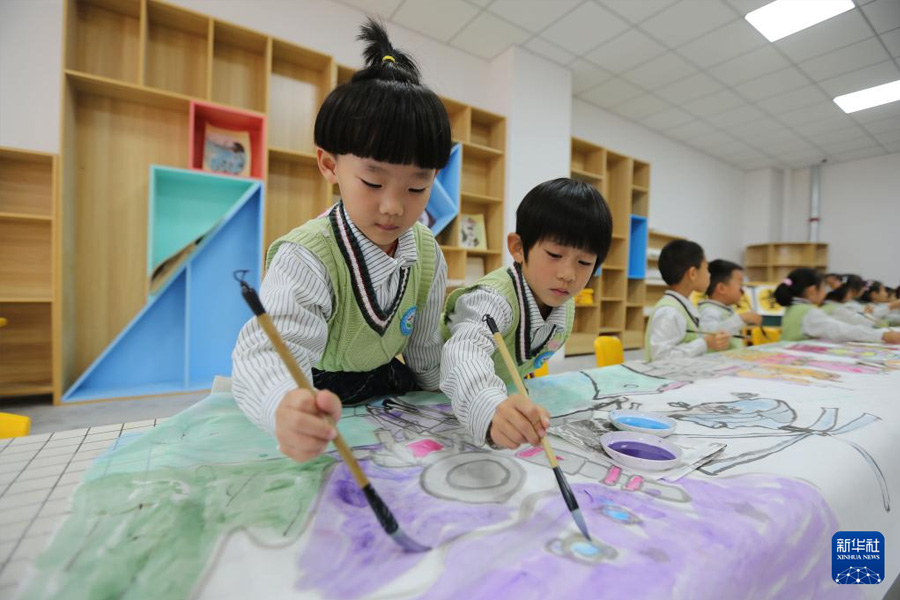 1/09月28日,甘肅省定西市安定區(qū)幼兒園的小朋友在繪制《我愛你中國》長卷。(新華社發(fā) 王克賢/攝)