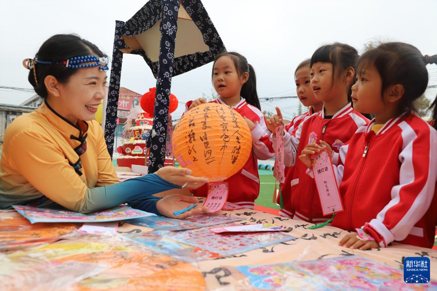 1/09月28日,在山東省濱州市沾化區(qū)馮家鎮(zhèn)李家幼兒園,孩子們在“拾趣品中秋 童心迎國慶”活動(dòng)上猜燈謎。(新華社發(fā) 賈海寧/攝)