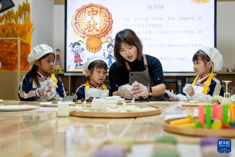 1/09月29日,在河南省商丘市睢縣古襄路幼兒園,小朋友們在老師的講解下學(xué)習(xí)制作冰皮月餅,了解中秋習(xí)俗。(新華社發(fā) 徐澤源/攝)
