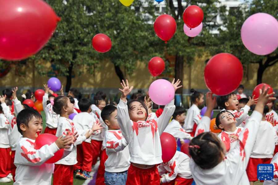 1/09月29日,河南省平頂山市寶豐縣鬧店鎮(zhèn)中心幼兒園的孩子們在放飛氣球。(新華社發(fā) 何五昌/攝)