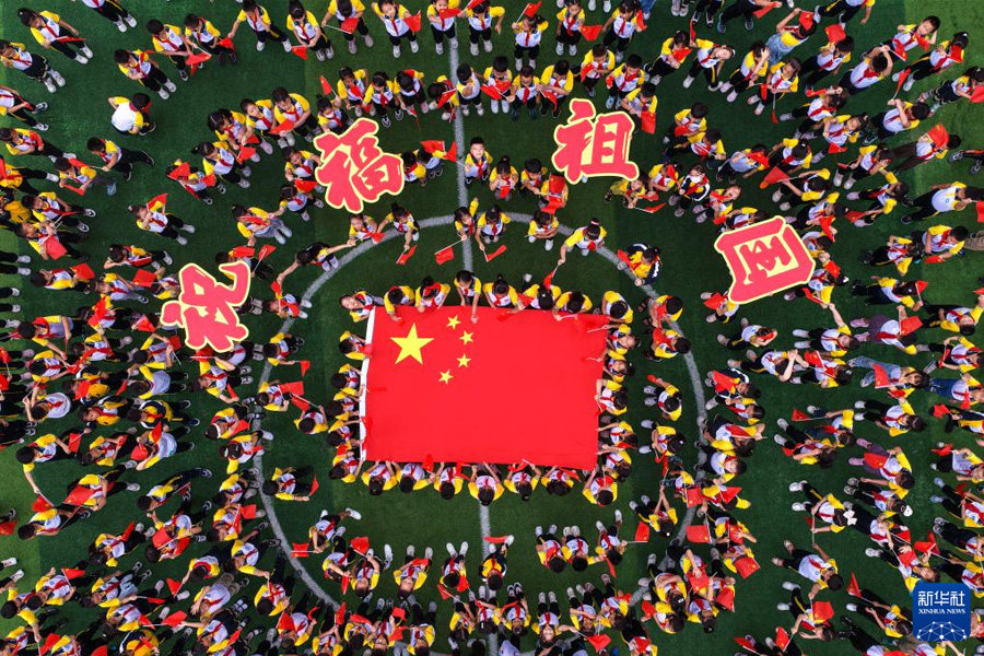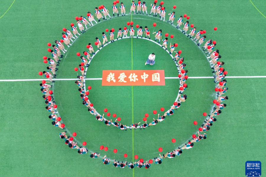 1/09月28日,江蘇省泰州市姜堰區(qū)東橋小學(xué)教育集團(tuán)東板橋校區(qū)學(xué)生學(xué)唱愛國歌曲,迎接國慶節(jié)(無人機(jī)照片)。(新華社發(fā) 周社根/攝)