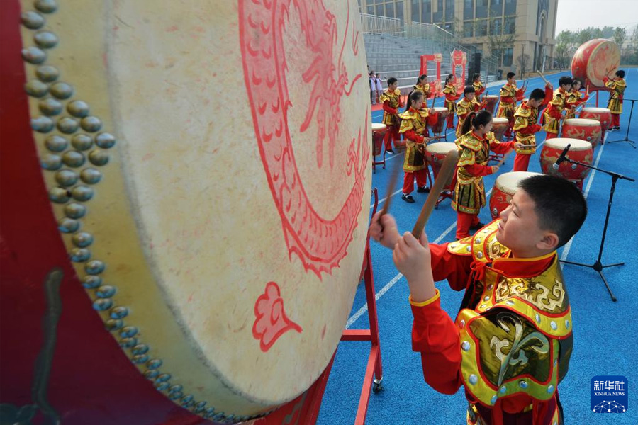 1/09月29日,在山東青島啟潤實(shí)驗(yàn)學(xué)校舉行的迎國慶主題活動(dòng)中,學(xué)生表演鼓舞。(新華社發(fā) 王海濱/攝)