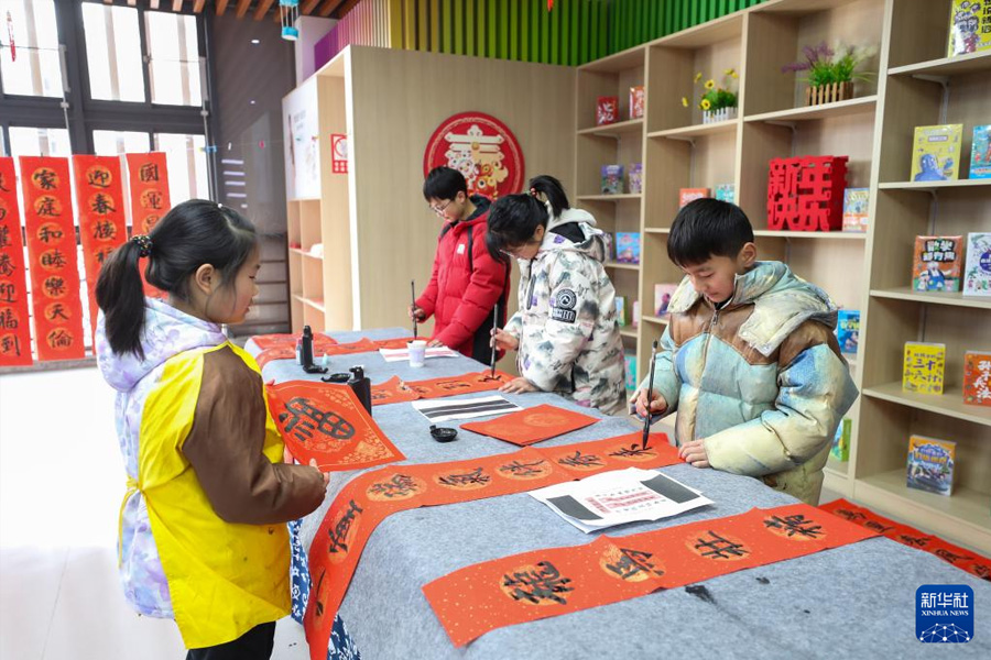 1/02月7日,在江蘇省興化市昭陽街道的一家新華書店,學(xué)生在“書香里的年味”新春主題活動中書寫對聯(lián)。(新華社發(fā) 周社根/攝)