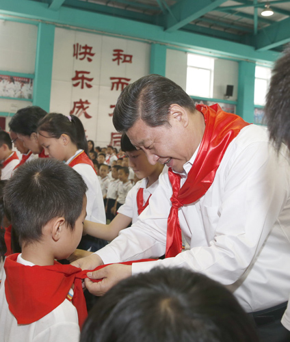 5月30日上午,中共中央總書記、國(guó)家主席、中央軍委主席習(xí)近平來(lái)到北京市海淀區(qū)民族小學(xué),參加慶?!傲弧眹?guó)際兒童節(jié)活動(dòng)。這是習(xí)近平在少先隊(duì)入隊(duì)儀式上,為新少先隊(duì)員系上紅領(lǐng)巾。(新華社記者 鞠鵬攝)