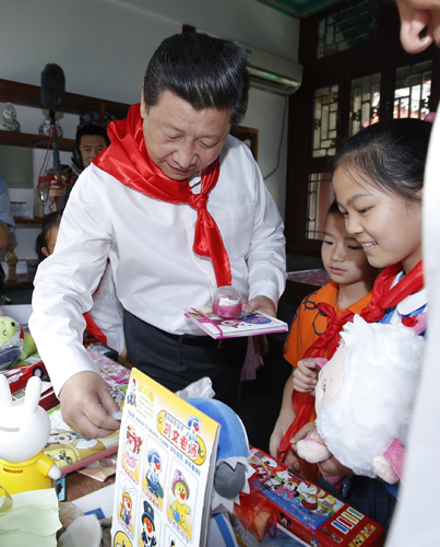 立人書院是校園內(nèi)一座古色古香的四合院,也是學(xué)生們開展社團(tuán)活動(dòng)的場(chǎng)所。一品軒內(nèi),學(xué)生們正在舉辦“少數(shù)民族文化展”。總書記的到來(lái)使孩子們喜出望外,學(xué)生們紛紛當(dāng)起小主人,介紹學(xué)校紅領(lǐng)巾志愿者同青海藏族、貴州水族小朋友開展手拉手、獻(xiàn)愛心活動(dòng)的情況。一張桌子上,擺放著學(xué)生們今年“六一”兒童節(jié)送給藏族、水族孩子的書籍和他們寫的信、畫的圖畫,總書記走過(guò)去仔細(xì)觀看,叮囑小朋友再寫信時(shí)捎上他的問(wèn)候和祝福。一位學(xué)生熱情邀請(qǐng)總書記參觀他們的“愛心義賣角”,習(xí)近平挑選了3件小文具,把10元錢投進(jìn)捐款箱,并在留言布上簽名。