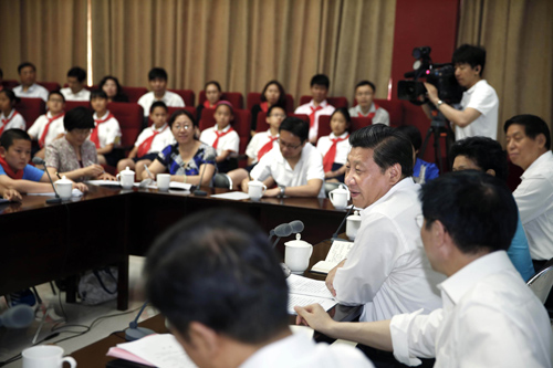 10時(shí)30分許,習(xí)近平來(lái)到學(xué)校北教學(xué)樓,主持召開座談會(huì)。學(xué)生代表和教師、家長(zhǎng)、少先隊(duì)輔導(dǎo)員、校外輔導(dǎo)員代表分別發(fā)言,圍繞當(dāng)好少先隊(duì)員、加強(qiáng)德育教育、搞好家?;?dòng)等問(wèn)題談了認(rèn)識(shí)和體會(huì)。習(xí)近平邊聽邊記,不時(shí)提問(wèn),詳細(xì)了解同學(xué)們的理想和志向、少年隊(duì)輔導(dǎo)員的工作、德育主任的設(shè)置、校外輔導(dǎo)員工作機(jī)制、家長(zhǎng)和學(xué)校關(guān)系等方面的情況,同大家深入討論。