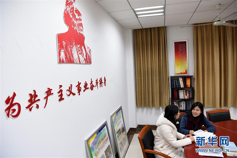 在南京航空航天大學大學生思想引領理論研究工作室,思政理論課教師何畏(右)與學生交流(1月11日攝)。她開設的《世界社會主義五百年》等公開課深受學生歡迎。 (新華社記者 馬寧/攝)