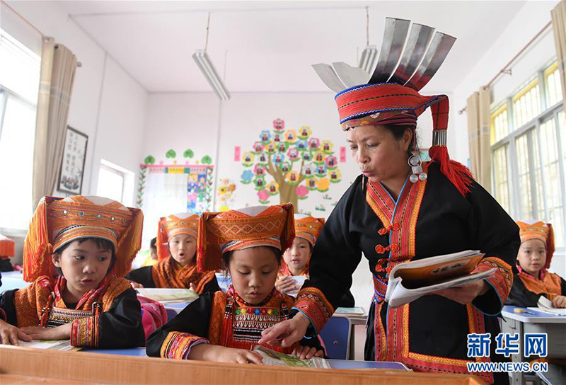 在廣西金秀瑤族自治縣忠良鄉(xiāng)山界教學點,教師陶鳳英在輔導學生學習。(6月4日新華社記者 陸波岸/攝)