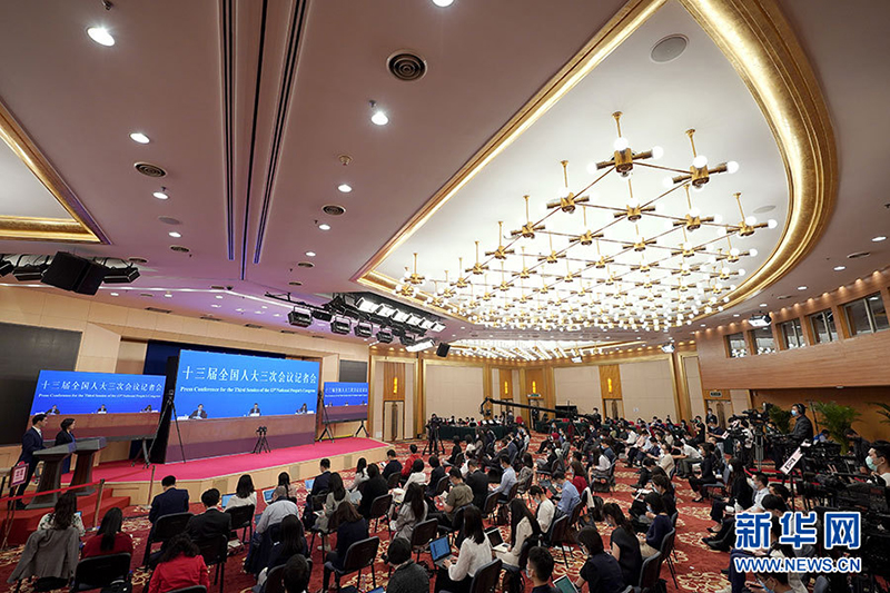 5月28日下午,十三屆全國人大三次會議在北京人民大會堂舉行記者會,國務院總理李克強應大會發(fā)言人張業(yè)遂的邀請出席記者會,并回答中外記者提問。這是記者在梅地亞中心多功能廳采訪。(新華社記者 劉金海/攝)