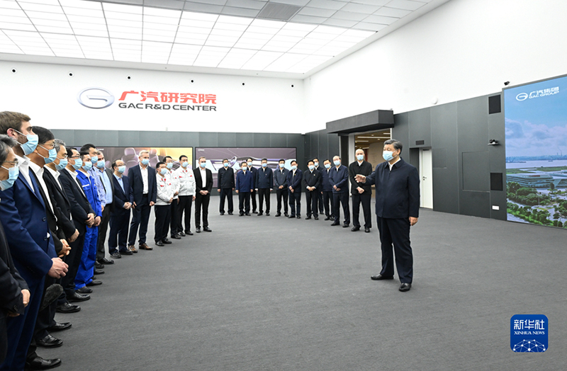 習(xí)近平隨后來到廣汽埃安新能源汽車股份有限公司考察。他走進(jìn)企業(yè)展廳、總裝車間、電池生產(chǎn)車間等,了解企業(yè)突破關(guān)鍵核心技術(shù)和推動制造業(yè)高端化、智能化、綠色化等進(jìn)展情況。在廣汽研究院,習(xí)近平仔細(xì)察看智能網(wǎng)聯(lián)實(shí)驗(yàn)室、模型設(shè)計實(shí)驗(yàn)室等,并同科技人員、企業(yè)家、職工、外資企業(yè)代表等交流。習(xí)近平指出,中國改革開放政策將長久不變,永遠(yuǎn)不會自己關(guān)上開放的大門。一切愿意與我們合作共贏的國家,我們都愿意與他們相向而行,推動世界經(jīng)濟(jì)共同繁榮發(fā)展。習(xí)近平強(qiáng)調(diào),中國是個大國,要重視實(shí)體經(jīng)濟(jì),走自力更生之路。關(guān)鍵核心技術(shù)要立足自主研發(fā),也歡迎國際合作。要加強(qiáng)教育和人才培養(yǎng),夯實(shí)科技自立自強(qiáng)根基。