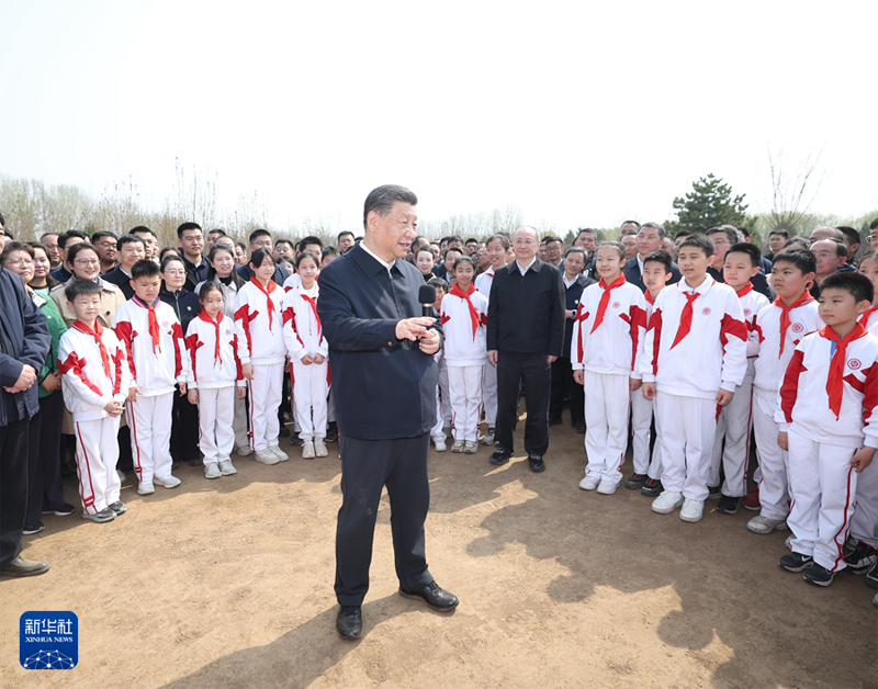 4月3日,黨和國家領(lǐng)導(dǎo)人習(xí)近平、李強、趙樂際、王滬寧、蔡奇、丁薛祥、李希、韓正等來到北京市通州區(qū)潞城鎮(zhèn)參加首都義務(wù)植樹活動。這是習(xí)近平同少先隊員在一起。(新華社記者 李學(xué)仁/攝)