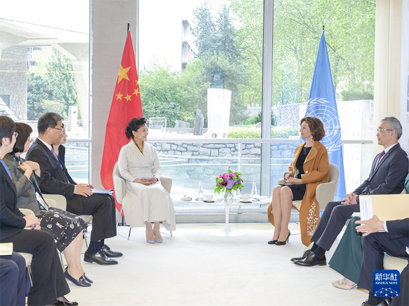 當(dāng)?shù)貢r間5月6日上午,國家主席習(xí)近平夫人、聯(lián)合國教科文組織促進(jìn)女童和婦女教育特使彭麗媛在巴黎應(yīng)邀參訪聯(lián)合國教科文組織總部并會見阿祖萊總干事。(新華社記者 丁林/攝)
