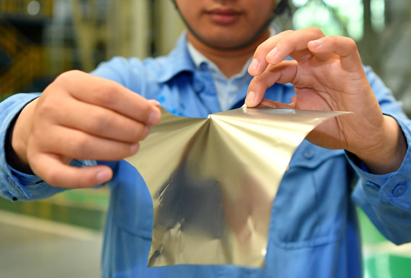 在位于山西的太鋼集團,員工展示用手撕開0.02毫米厚的超薄帶狀不銹鋼(2019年5月24日攝)。(新華社記者 曹陽/攝)