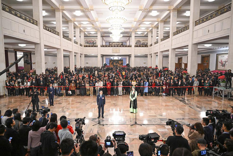 閉幕會前,人民大會堂中央大廳北側(cè),第三場“代表通道”集體采訪活動(dòng)正在進(jìn)行。