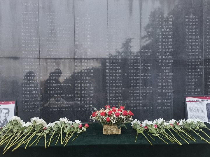 在南京抗日航空烈士紀(jì)念館鐫刻有蘇聯(lián)籍抗日航空英烈名錄的紀(jì)念碑前,擺放著人們獻(xiàn)上的鮮花(2024年11月22日攝)。(新華社記者 邱冰清/攝)