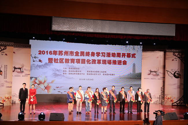 2016年10月28日,蘇州市全民終身學(xué)習(xí)活動周開幕式暨社區(qū)教育項目化改革現(xiàn)場推進(jìn)會在張家港市金港鎮(zhèn)隆重舉行。本次活動周的主題為“扎實推進(jìn)社區(qū)教育,建設(shè)學(xué)習(xí)型蘇州”。中國成人教育協(xié)會、江蘇省成人教育協(xié)會、江蘇省教育廳、蘇州市人民政府的領(lǐng)導(dǎo)與會并講話。蘇州市、張家港市文明辦、發(fā)改委、民政局、科技局、財政局、人社局、農(nóng)委、文廣新局、體育局、總工會、團委、婦聯(lián)、科協(xié)等部門的相關(guān)領(lǐng)導(dǎo)及蘇州開放大學(xué)、蘇州市老年大學(xué)、蘇州市終身教育學(xué)會、蘇州市轄各市、區(qū)教育局、開放大學(xué)(社區(qū)學(xué)院)、鎮(zhèn)街社區(qū)教育中心的相關(guān)領(lǐng)導(dǎo)、專家及市民代表共700余人參加了本次活動。開幕式為獲得2016年蘇州市學(xué)習(xí)之星、首屆蘇州市社區(qū)教育教學(xué)優(yōu)秀成果獎和蘇州市第三批學(xué)習(xí)型鄉(xiāng)鎮(zhèn)(街道)等榮譽稱號的單位及個人進(jìn)行了頒獎。全體與會人員參觀了蘇州社區(qū)教育成果展和南沙社區(qū)。