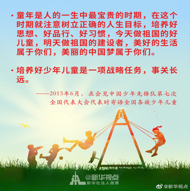 少年兒童是祖國的花朵,民族的希望。幼有所育,讓每一名少年兒童都能伴隨著時代的腳步茁壯成長,是全社會共同的心愿。習(xí)近平總書記始終關(guān)心少年兒童的身體健康和成長成才。黨的十八大以來,習(xí)近平總書記這樣說?