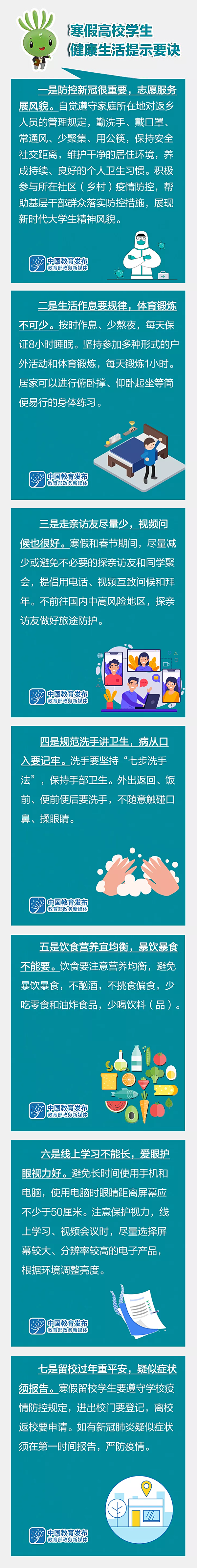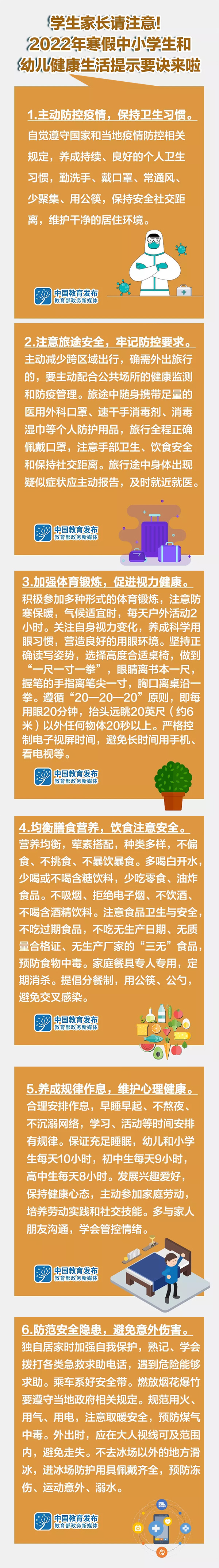 2022年寒假臨近,近日,教育部指導(dǎo)全國高校健康教育教學(xué)指導(dǎo)委員會專家,提出2022年寒假高校學(xué)生健康生活提示要訣,引導(dǎo)高校學(xué)生增強“健康第一責(zé)任人”意識,合理安排寒假生活和學(xué)習(xí),積極參與疫情防控,養(yǎng)成健康生活方式。