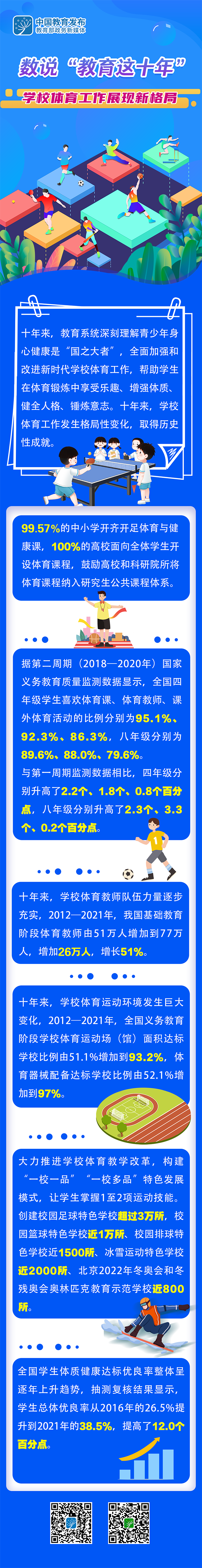 99.57%的中小學(xué)開齊開足體育與健康課,100%的高校面向全體學(xué)生開設(shè)體育課程……十年來,學(xué)校體育工作發(fā)生格局性變化。今天的“教育新征‘圖’”專欄通過一組數(shù)據(jù),“圖”說學(xué)校體育工作這十年——