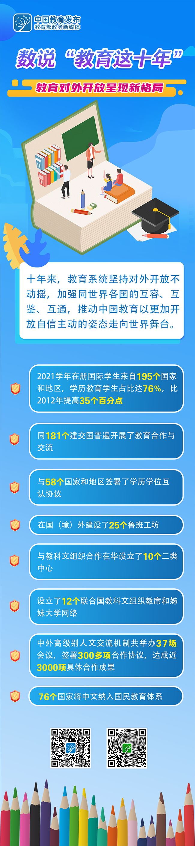 教育是國之大計、黨之大計。黨的十八大以來,我國教育面貌正在發(fā)生格局性變化。今天的“教育新征‘圖’”專欄通過一組數(shù)據(jù),“圖”說十年來教育對外開放呈現(xiàn)新格局——
