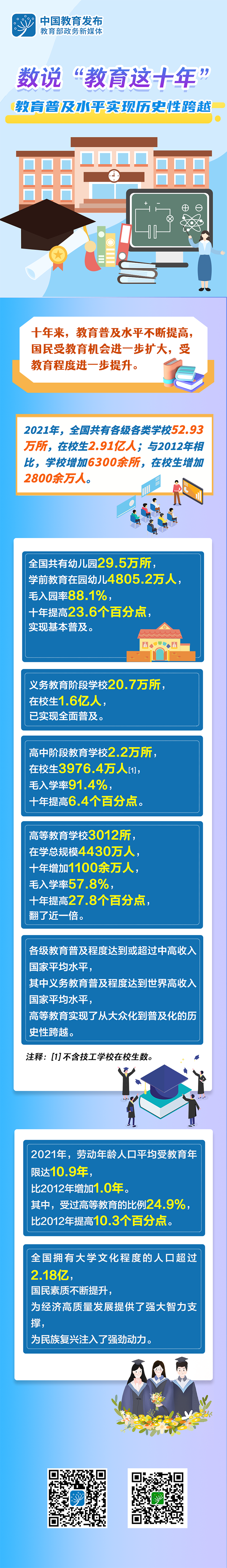 教育是國之大計、黨之大計。黨的十八大以來,我國教育面貌正在發(fā)生格局性變化。即日起,教育部政務新媒體推出“教育新征‘圖’”專欄,“圖”說教育這十年,迎接黨的二十大勝利召開。今天,跟教育小微通過一組數(shù)據(jù)了解“教育普及水平實現(xiàn)歷史性跨越”——