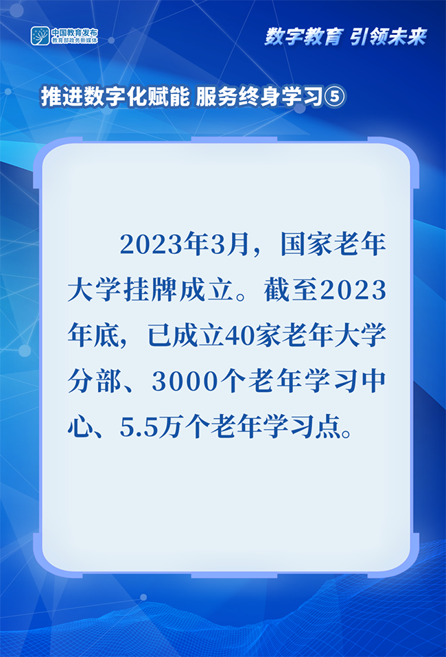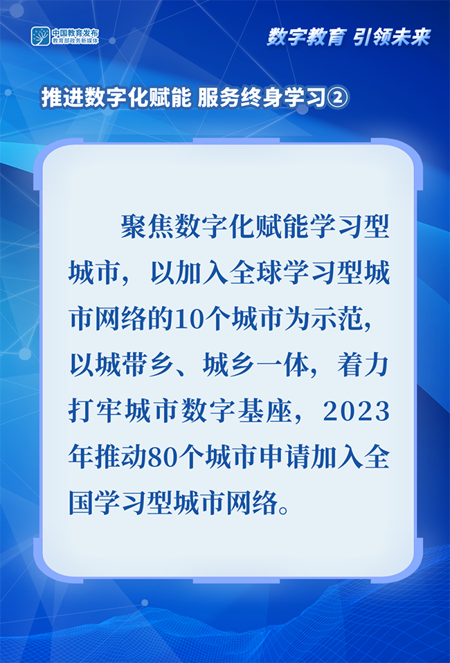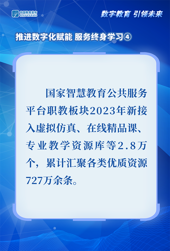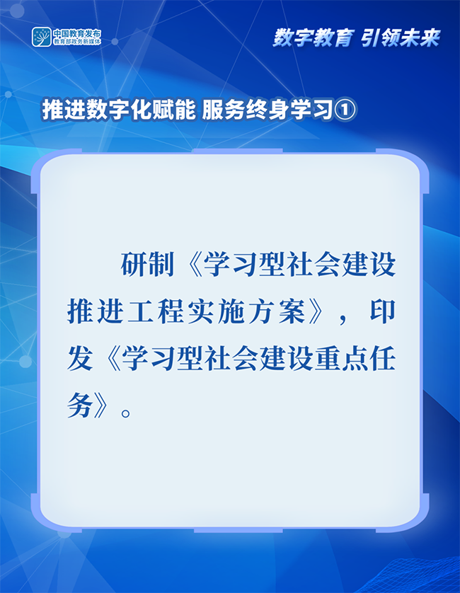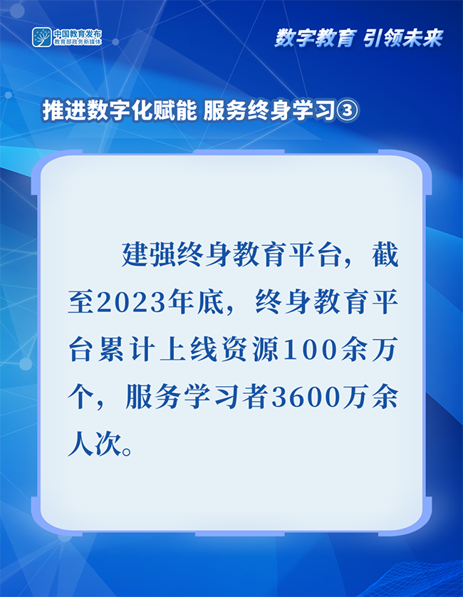2024世界數(shù)字教育大會(huì)將于1月29日-31日舉辦。教育部政務(wù)新媒體推出系列圖解,帶你了解我國(guó)推進(jìn)教育數(shù)字化工作和建設(shè)學(xué)習(xí)型社會(huì)、學(xué)習(xí)型大國(guó)相關(guān)舉措。今天一起看如何推進(jìn)數(shù)字化賦能,服務(wù)終身學(xué)習(xí)——