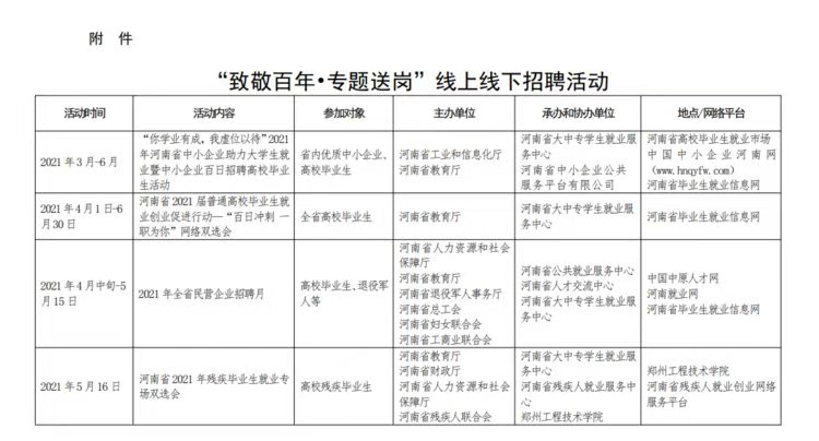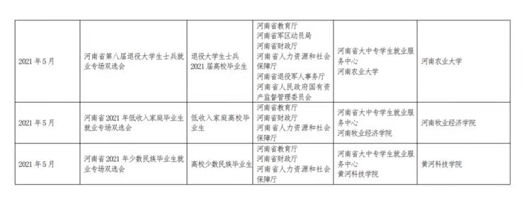 “致敬百年?專題送崗”線上線下招聘交流活動。5月13日至19日,省教育廳聯(lián)合14個省直部門共同開展“新時代·新夢想”特殊群體畢業(yè)生就業(yè)公益幫扶行動,舉辦退役大學(xué)生士兵、殘疾畢業(yè)生、低收入家庭畢業(yè)生、少數(shù)民族畢業(yè)生等就業(yè)專場雙選會。各高校將積極參與教育部“24365 校園招聘服務(wù)”百日招聘行動及我省2021屆普通高校畢業(yè)生就業(yè)創(chuàng)業(yè)促進(jìn)行動——“百日沖刺,一職為你”網(wǎng)絡(luò)雙選會、“你學(xué)業(yè)有成,我虛位以待”2021年河南省中小企業(yè)助力大學(xué)生就業(yè)暨中小企業(yè)百日招聘高校畢業(yè)生活動,高頻次高質(zhì)量開展線上線下校園招聘會。