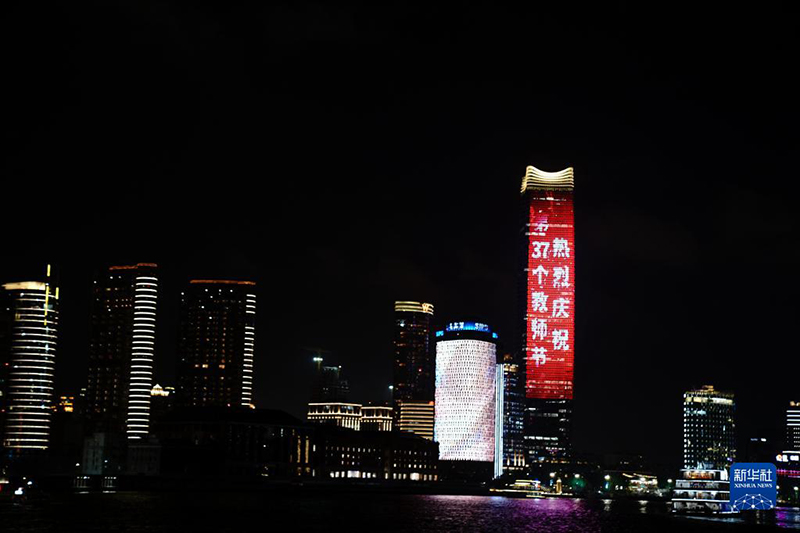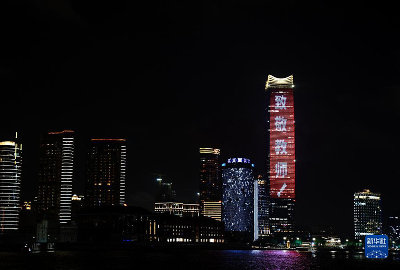 9月10日在上海外灘拍攝的燈光秀。當日是我國第37個教師節(jié),上海外灘上演“燈光秀”點亮祝福語,向廣大教師致敬。(新華社記者 張建松/攝)