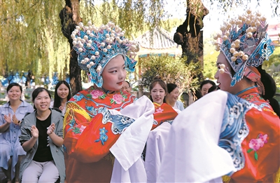 9月8日,山東省棗莊市市中區(qū)回民小學(xué)學(xué)生為老師表演京劇《貴妃醉酒》片段。(吉喆/攝)