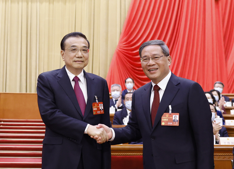3月11日,十四屆全國(guó)人大一次會(huì)議在北京人民大會(huì)堂舉行第四次全體會(huì)議,根據(jù)國(guó)家主席習(xí)近平的提名,經(jīng)過(guò)投票表決,決定李強(qiáng)為中華人民共和國(guó)國(guó)務(wù)院總理。這是李強(qiáng)同李克強(qiáng)握手。(新華社記者 黃敬文/攝)