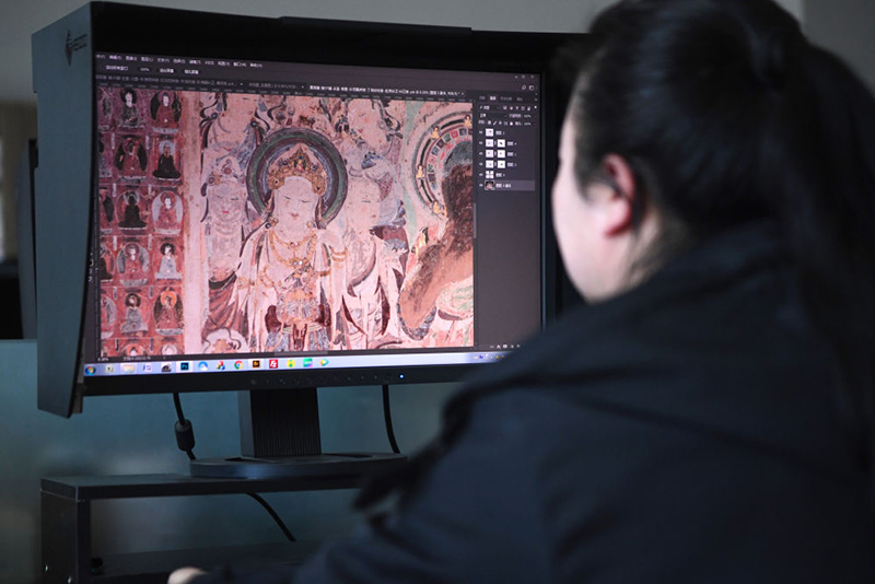 敦煌研究院文物數(shù)字化保護(hù)團(tuán)隊(duì)圖像處理人員年海麗在拼接壁畫圖像(2023年4月25日攝)。數(shù)字化探索為莫高窟的保護(hù)與傳承開辟了全新路徑,數(shù)字技術(shù)讓敦煌文物走出洞窟,跨出國門,走向“永久保存、永續(xù)利用”。(新華社記者 陳斌/攝)